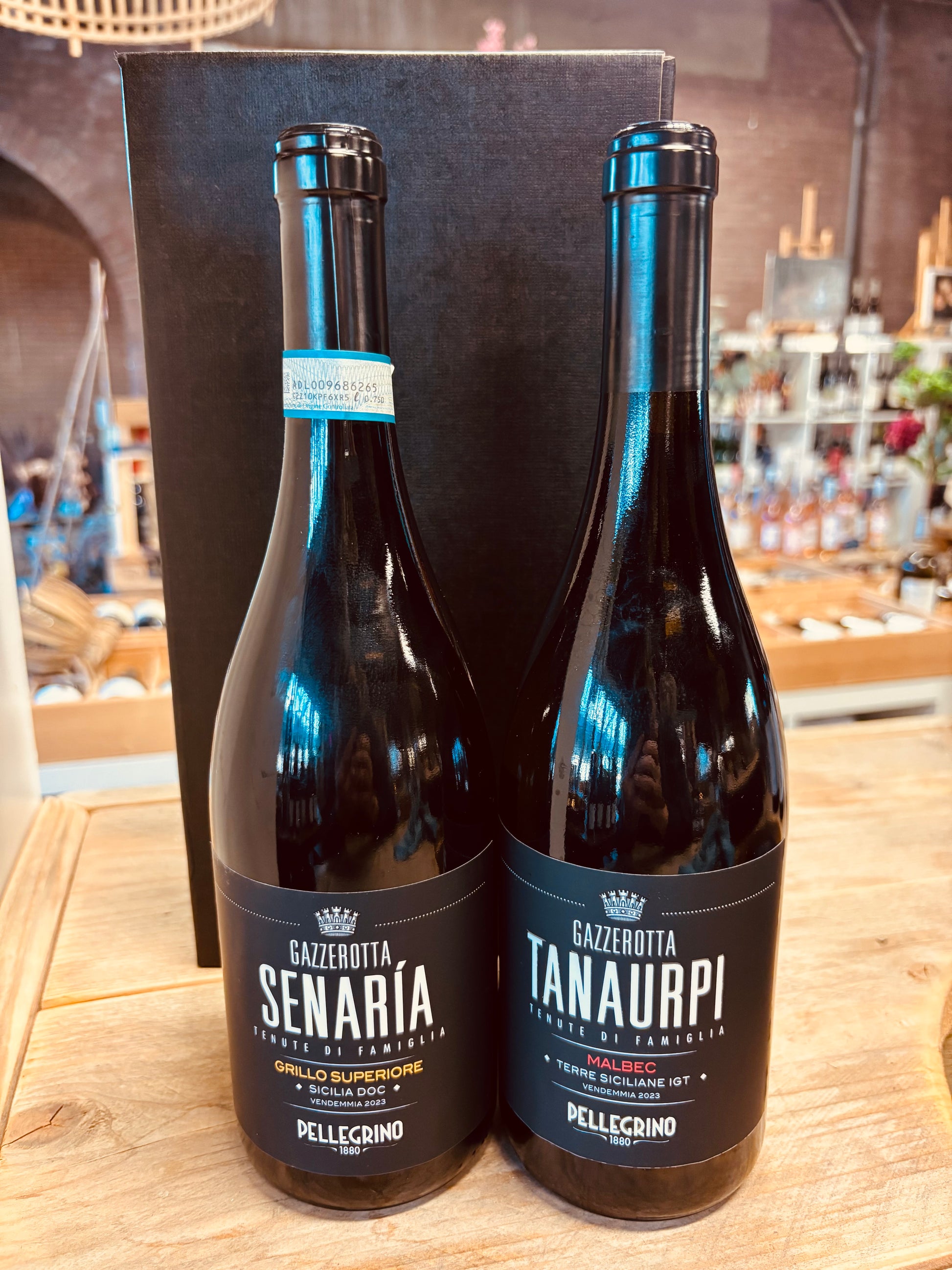 Twee wijnen van het huis Pellegrino in Sicilië. 1 x Gazzerotta Senaria Grillo Superiore en 1 x Gazzerotta Tanaurpi Malbec in zwarte geschenkdoos.