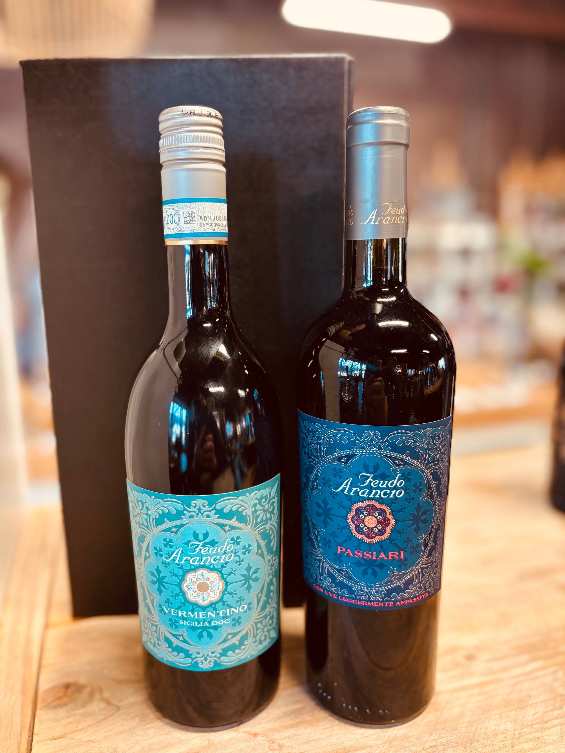 Twee wijnen van het huis Feuro Arancio in Sicilië. 1 x vermentino (wit) en 1 x Passiari van Nero d’Avola/Cabernet Sauvignon (rood) in zwarte geschenkdoos.