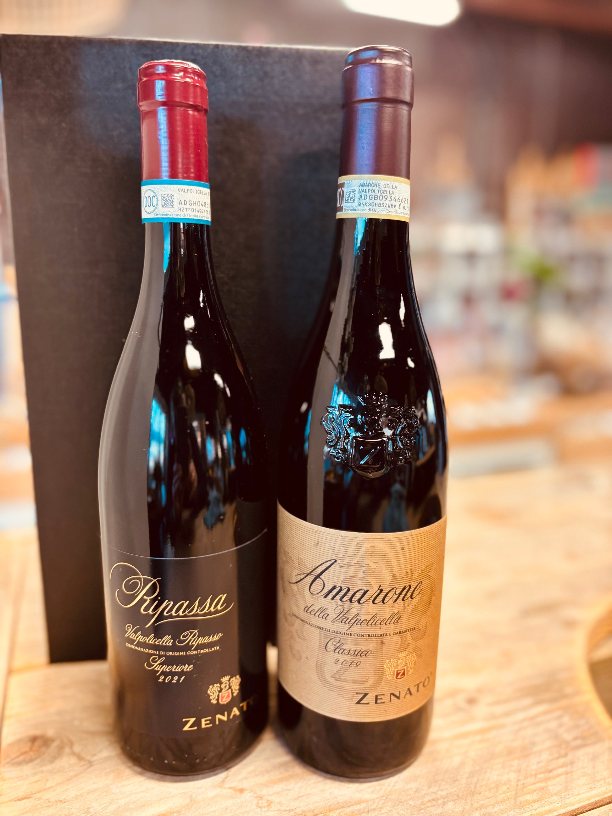 1 x Valpolicella Ripasso Superiore en 1 x Amarone di Valpolicella van Zenato in zwarte geschenkdoos.