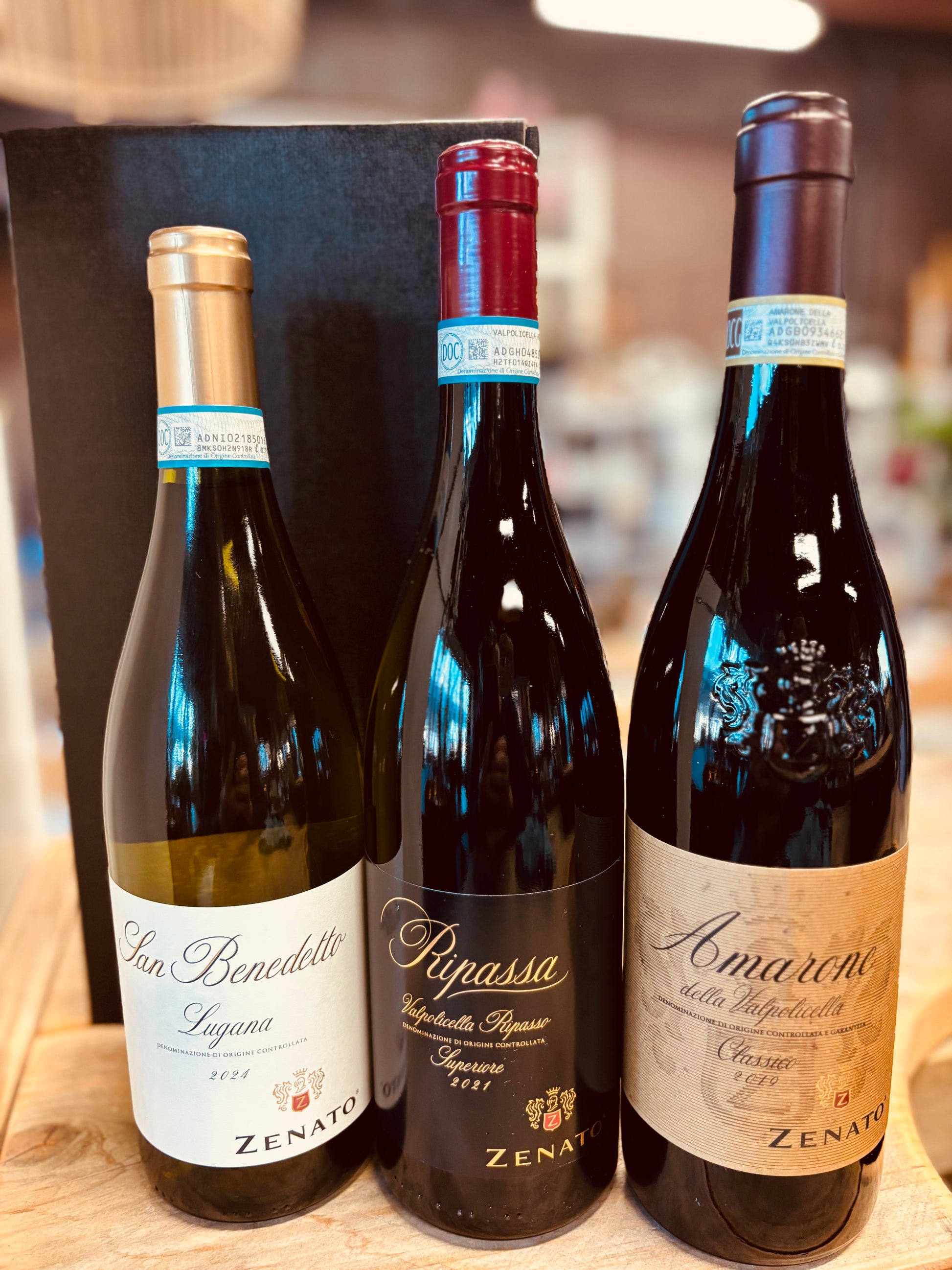 1 x San Benedetto Lugana, 1 x Valpolicella Ripasso Superiore en 1 x Amarone di Valpolicella van Zenato in zwarte geschenkdoos.