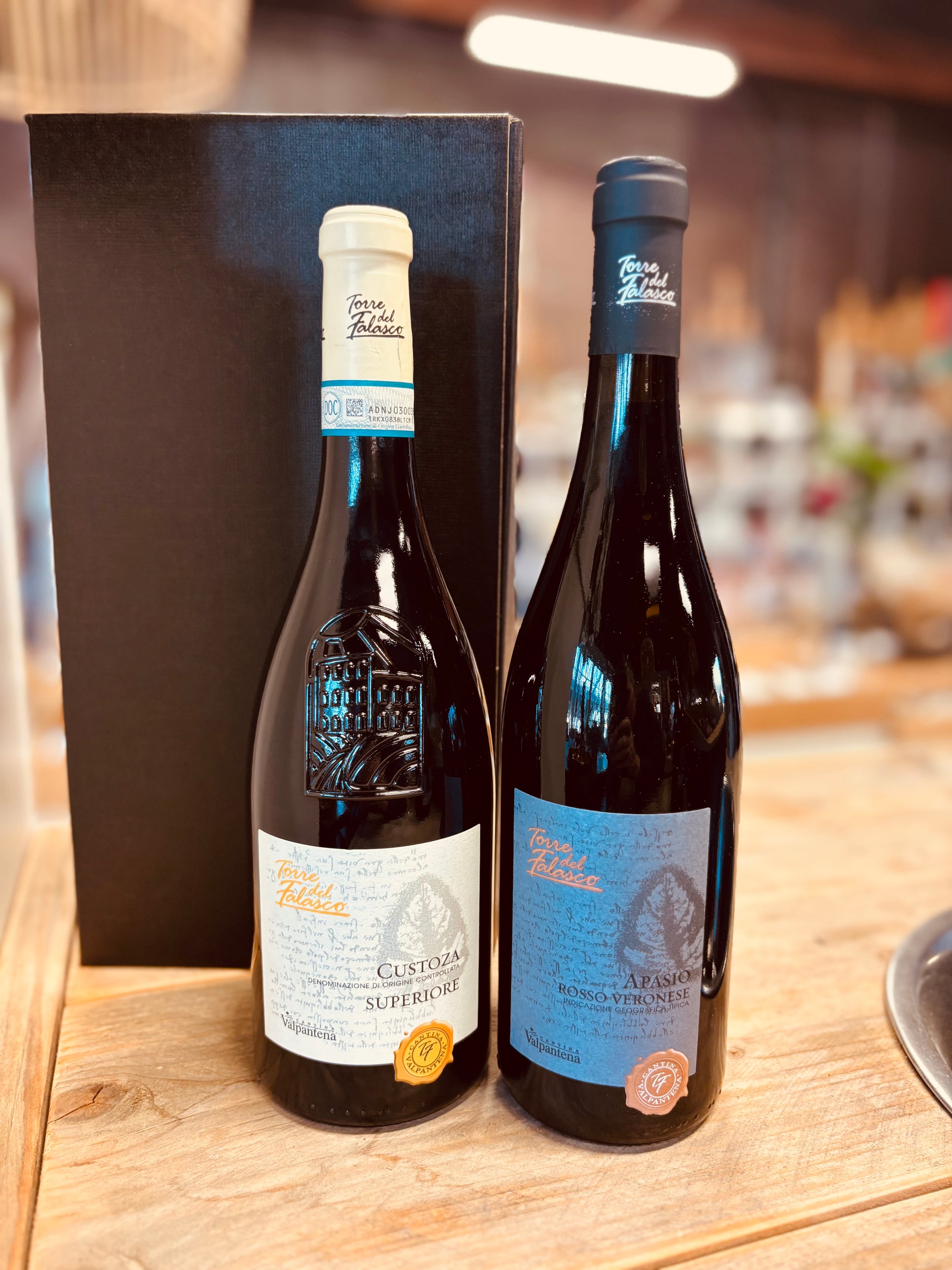 1 x Bianco di Custoza en 1 x Apasio Rosso Veronese van Torre del Falasco in zwarte geschenkdoos.